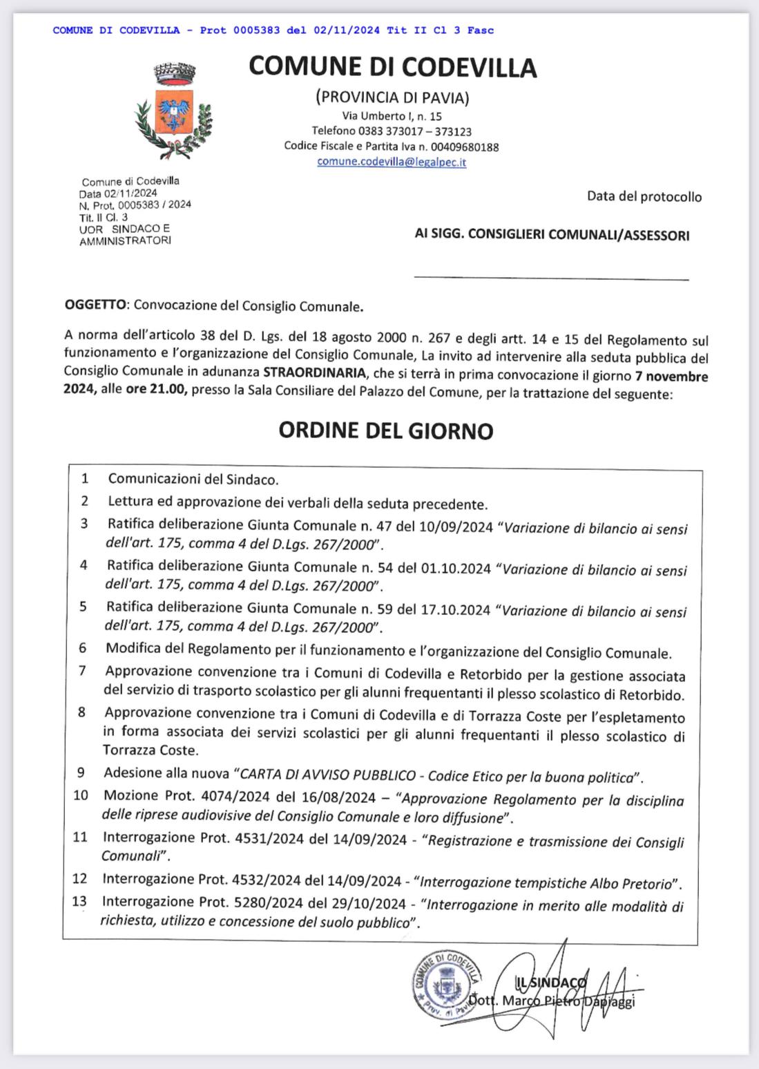 Convocazione del Consiglio Comunale per il giorno 7 novembre 2024 alle ore 21:00, in adunanza straordinaria, presso la Sala Consiliare - Palazzo del Comune - Via Umberto I n. 15 piano primo.